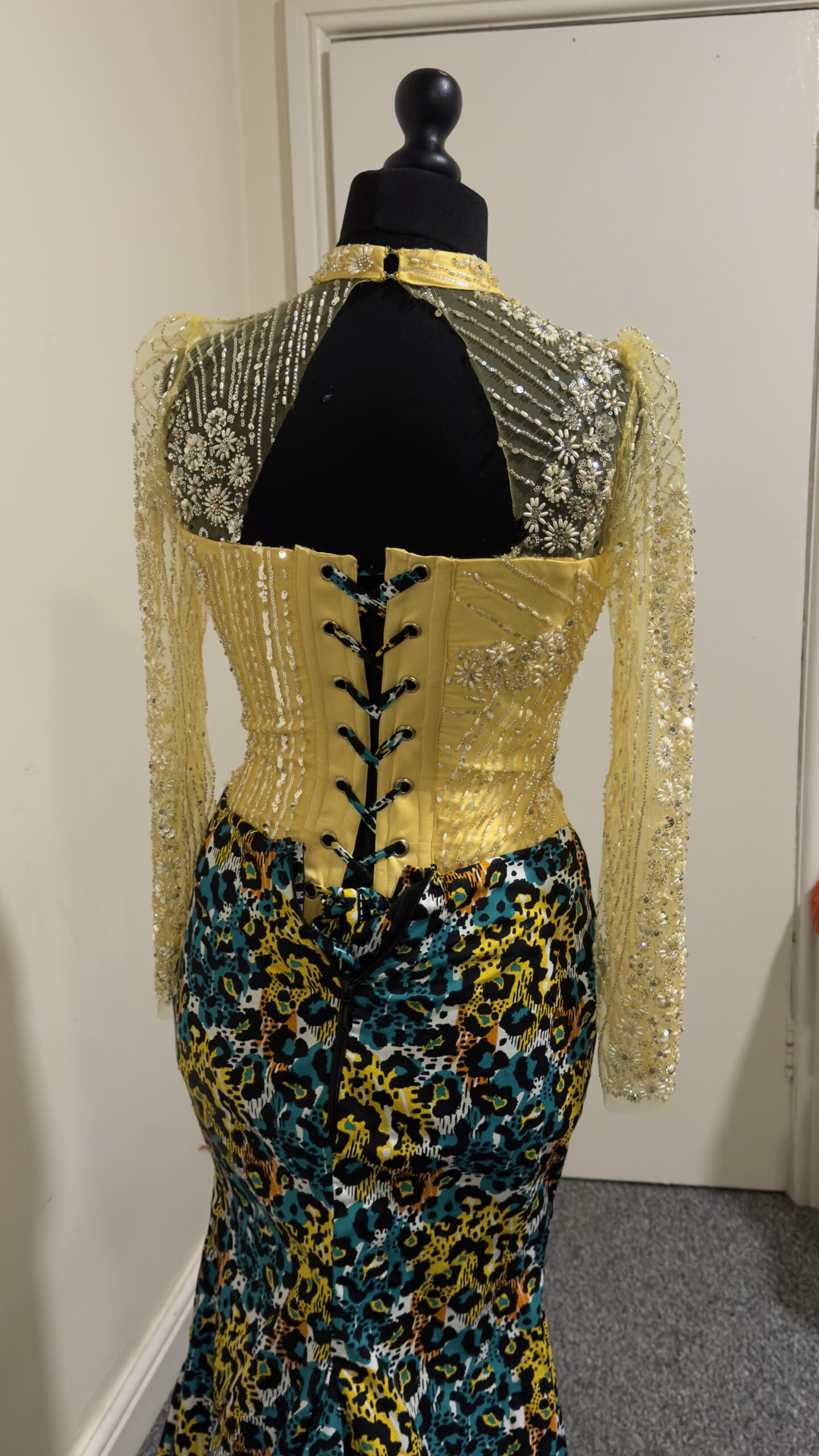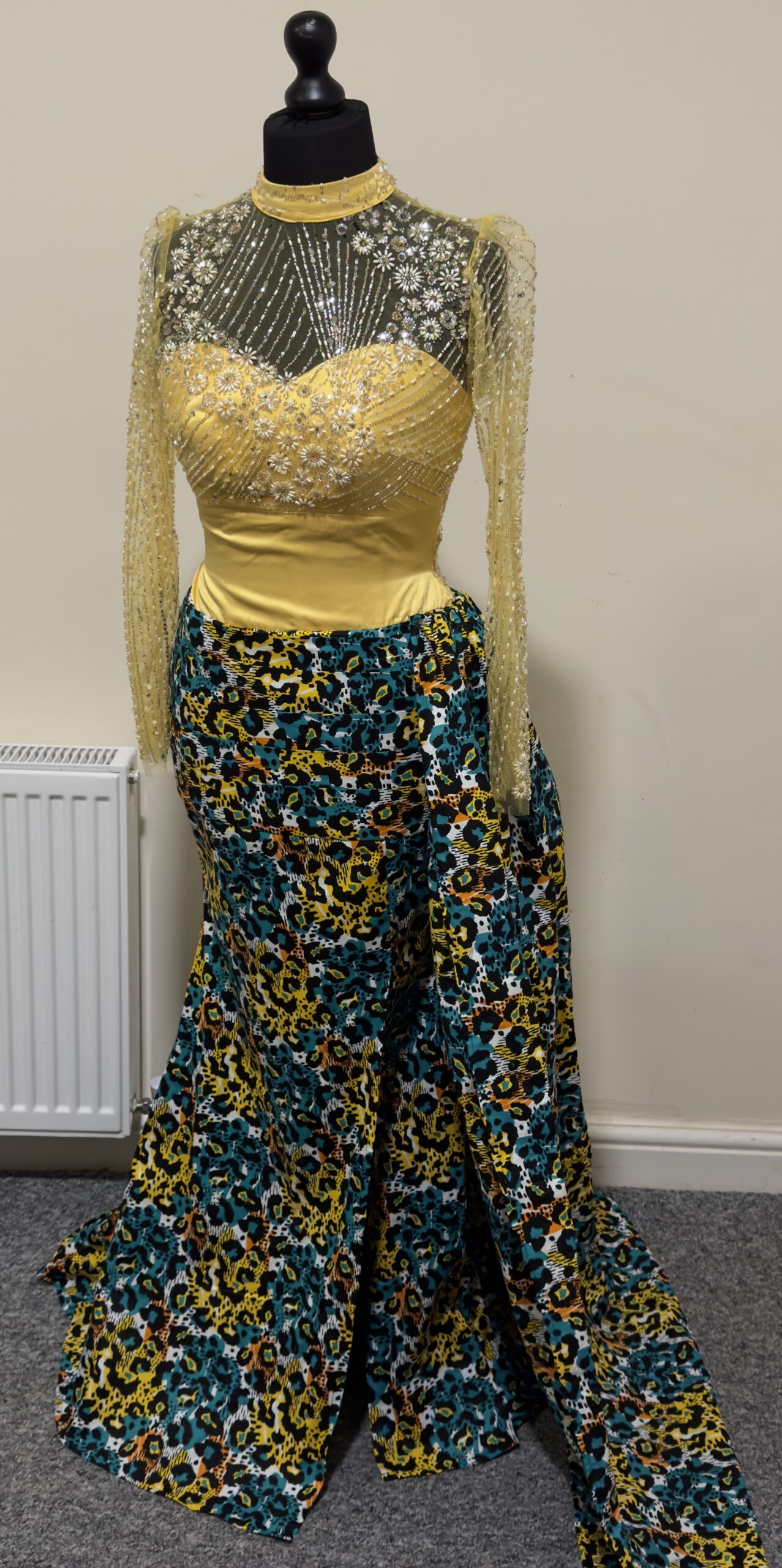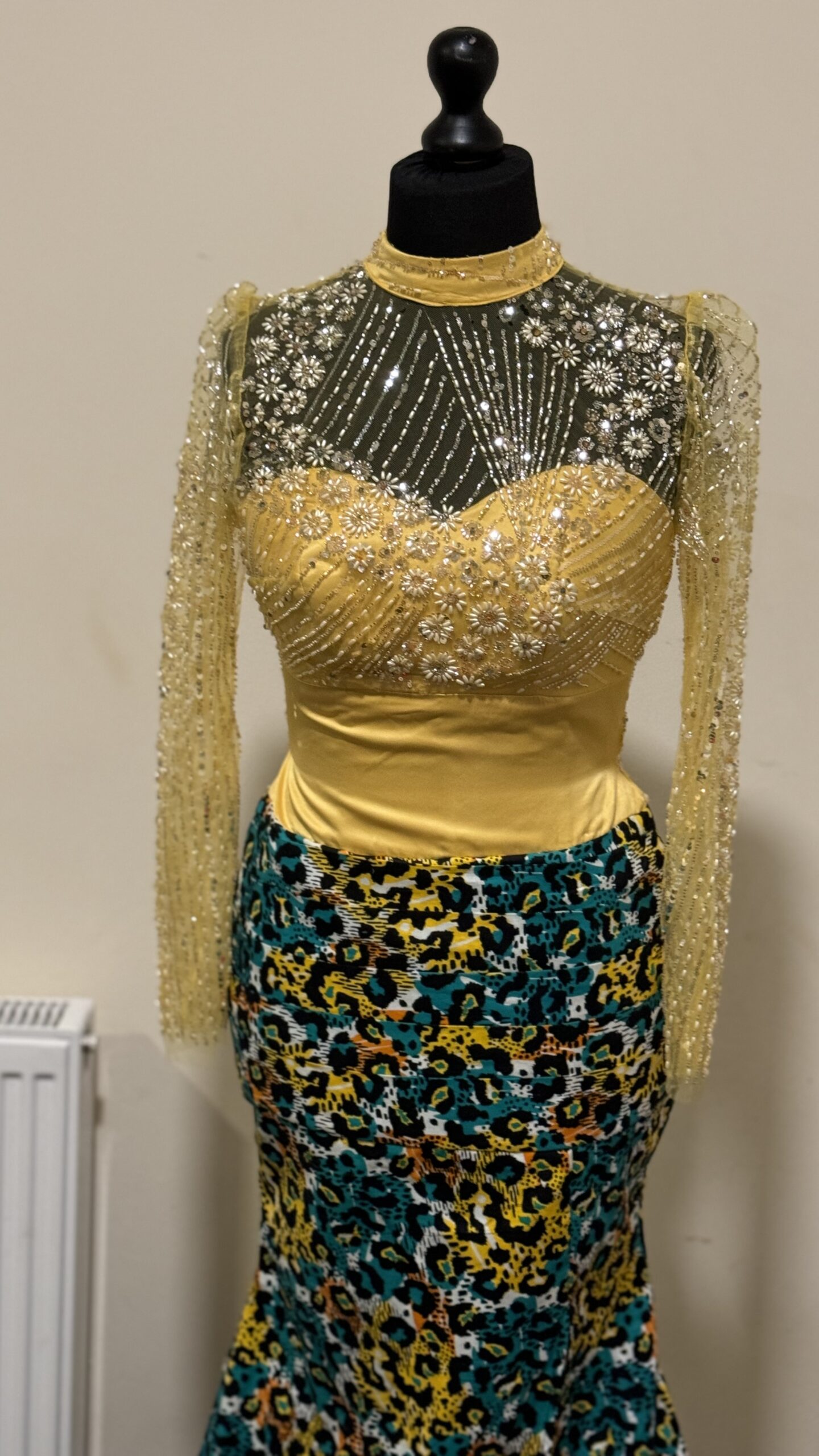 - Bold Colors: We love the mix of bright yellow with the unique teal and gold pattern on the skirt.