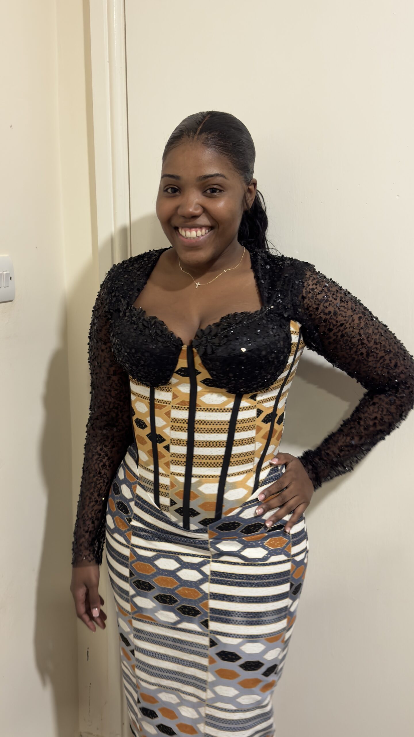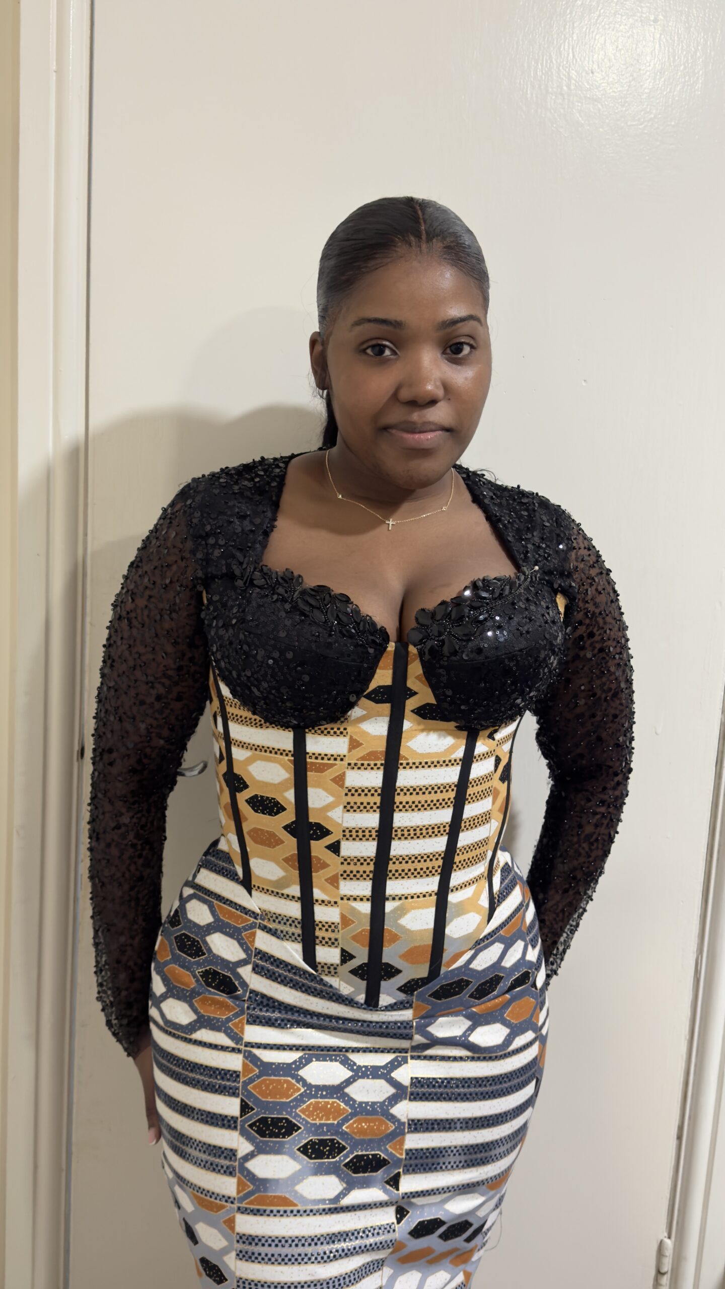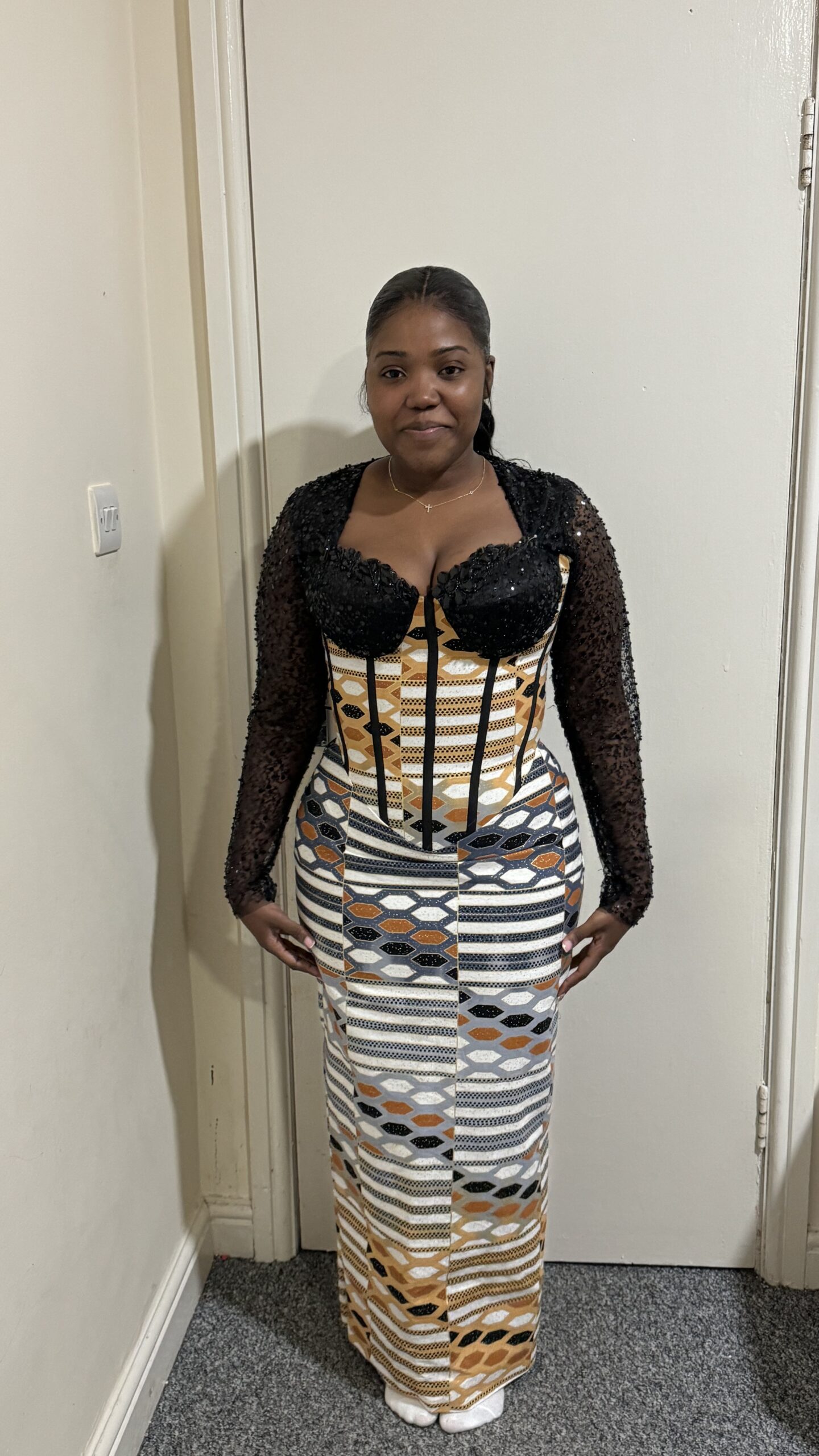 Show off your style in this unique and beautiful long dress. It mixes a modern corset top with a traditional patterned skirt for a look that is bold and classy.