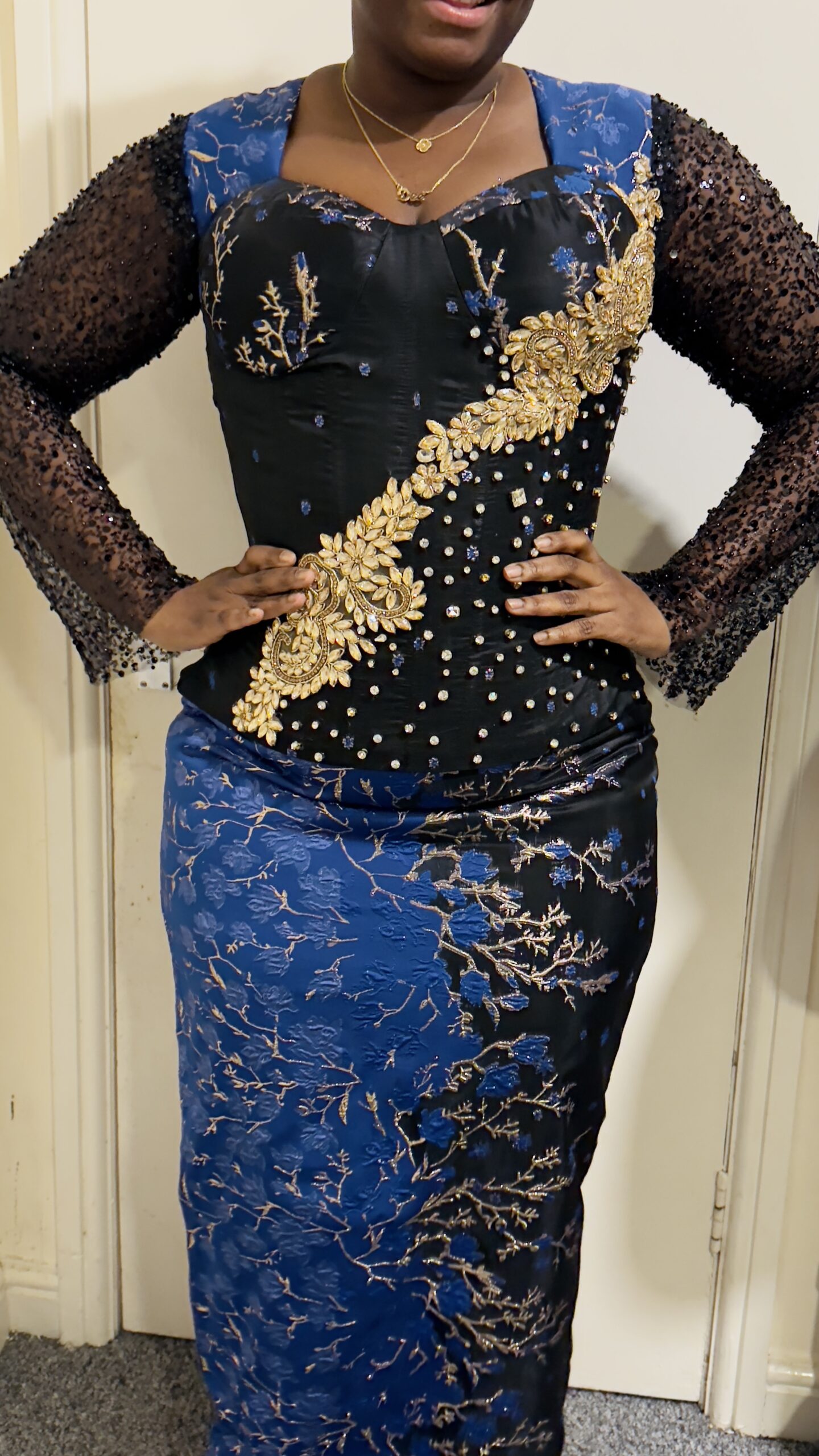 Feel like royalty in this stunning blue and black skirt and blouse. It features beautiful gold details and an elegant floral design that flows from the top to the bottom.
