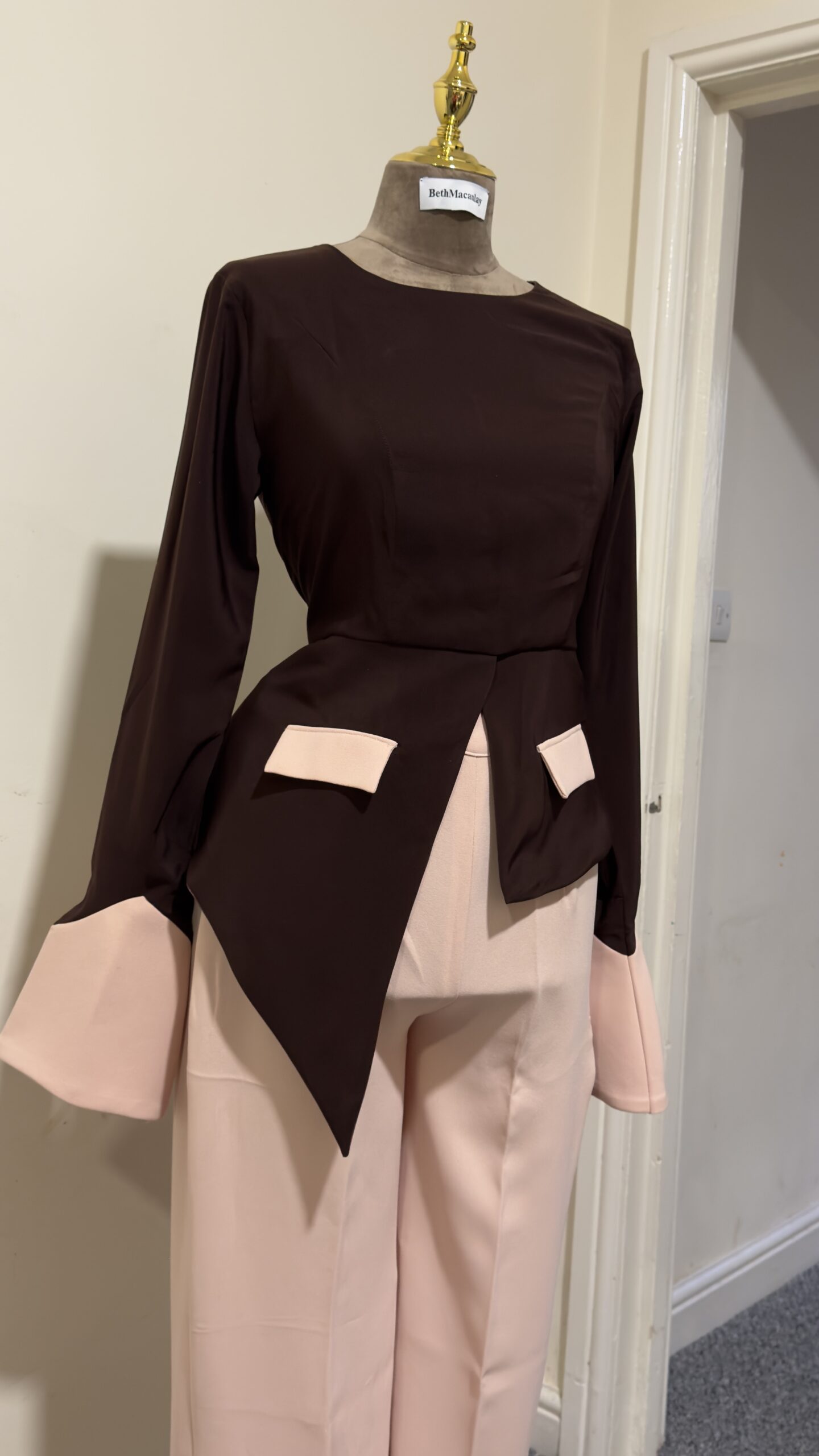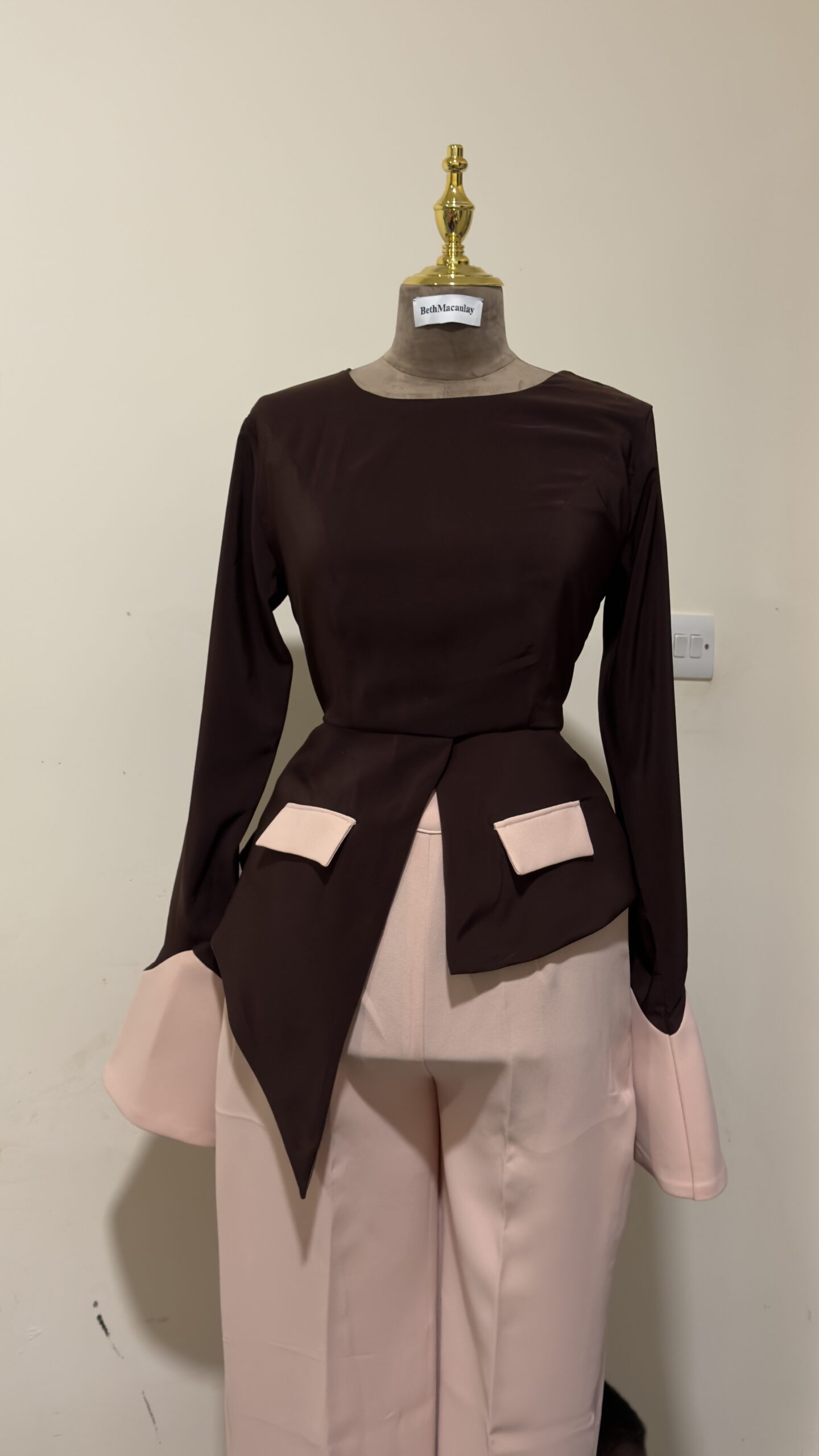 Look sharp and sophisticated in this unique two-piece set. Combining a deep chocolate brown with soft peach accents, this outfit is designed for a modern, high-fashion look that works for the office or a special event.