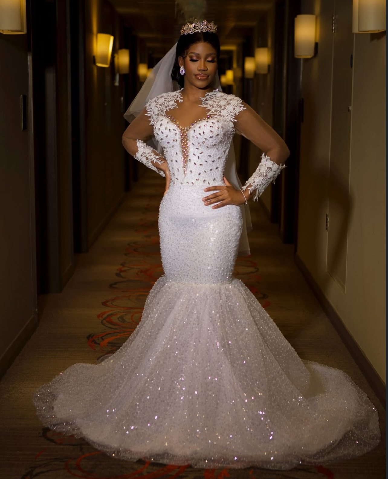 • Dramatic Silhouette: The classic mermaid cut hugs the curves before erupting into a voluminous, sparkling train.