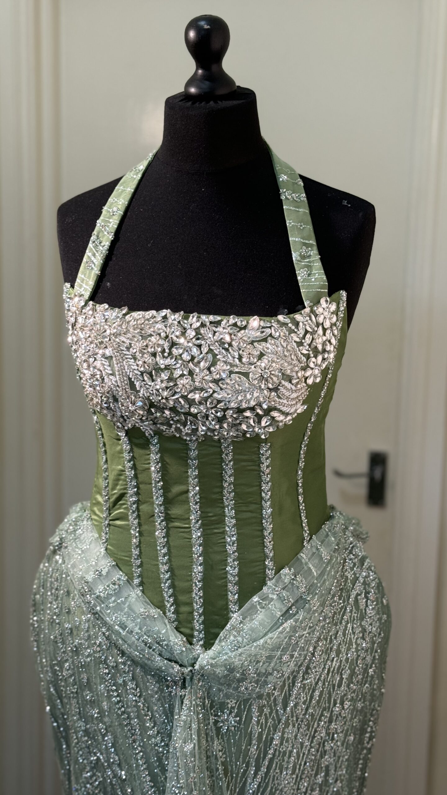 - Structured Corset: Vertical crystal boning on the olive-green midsection provides a perfectly snatched and supported waistline.