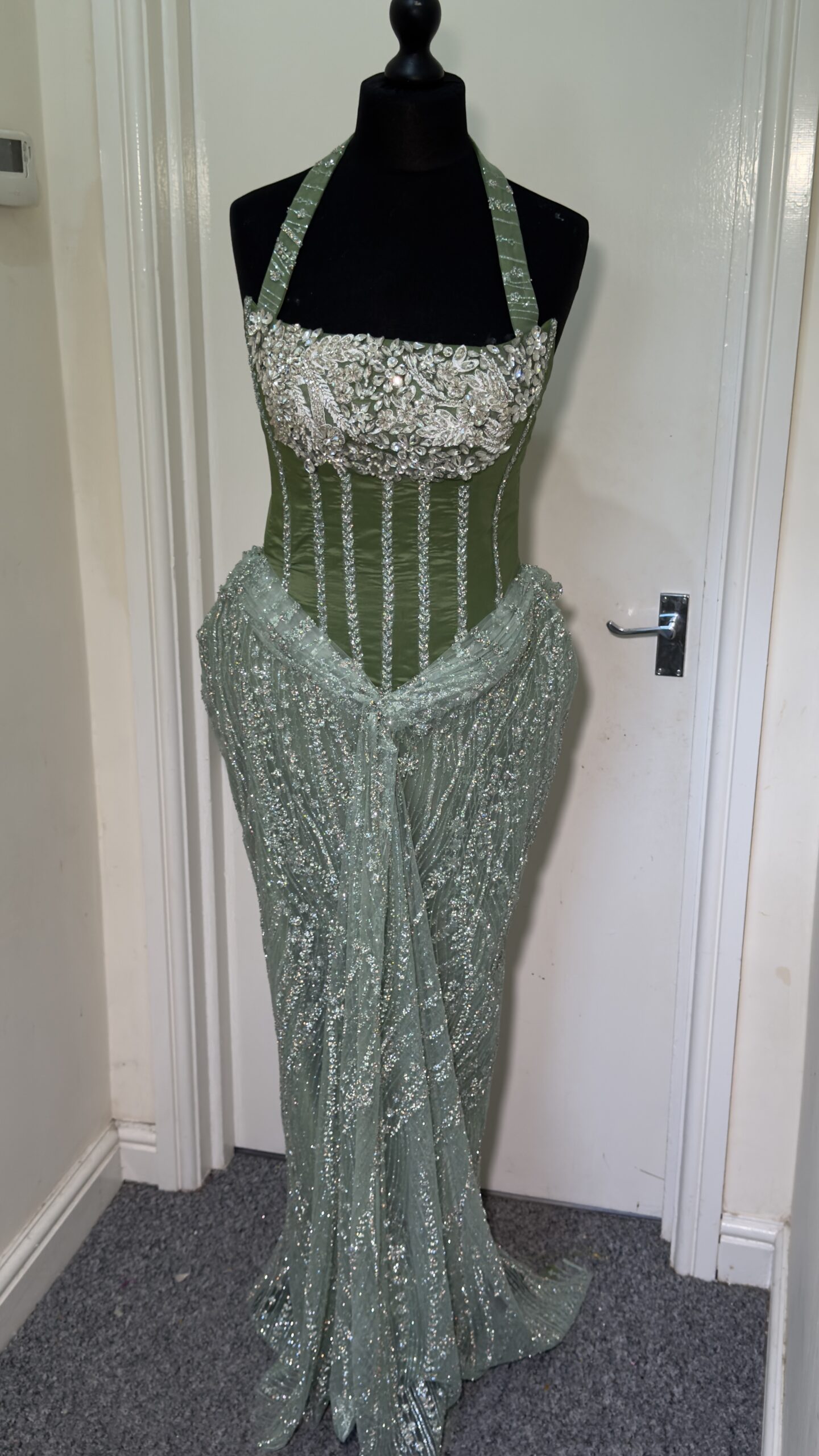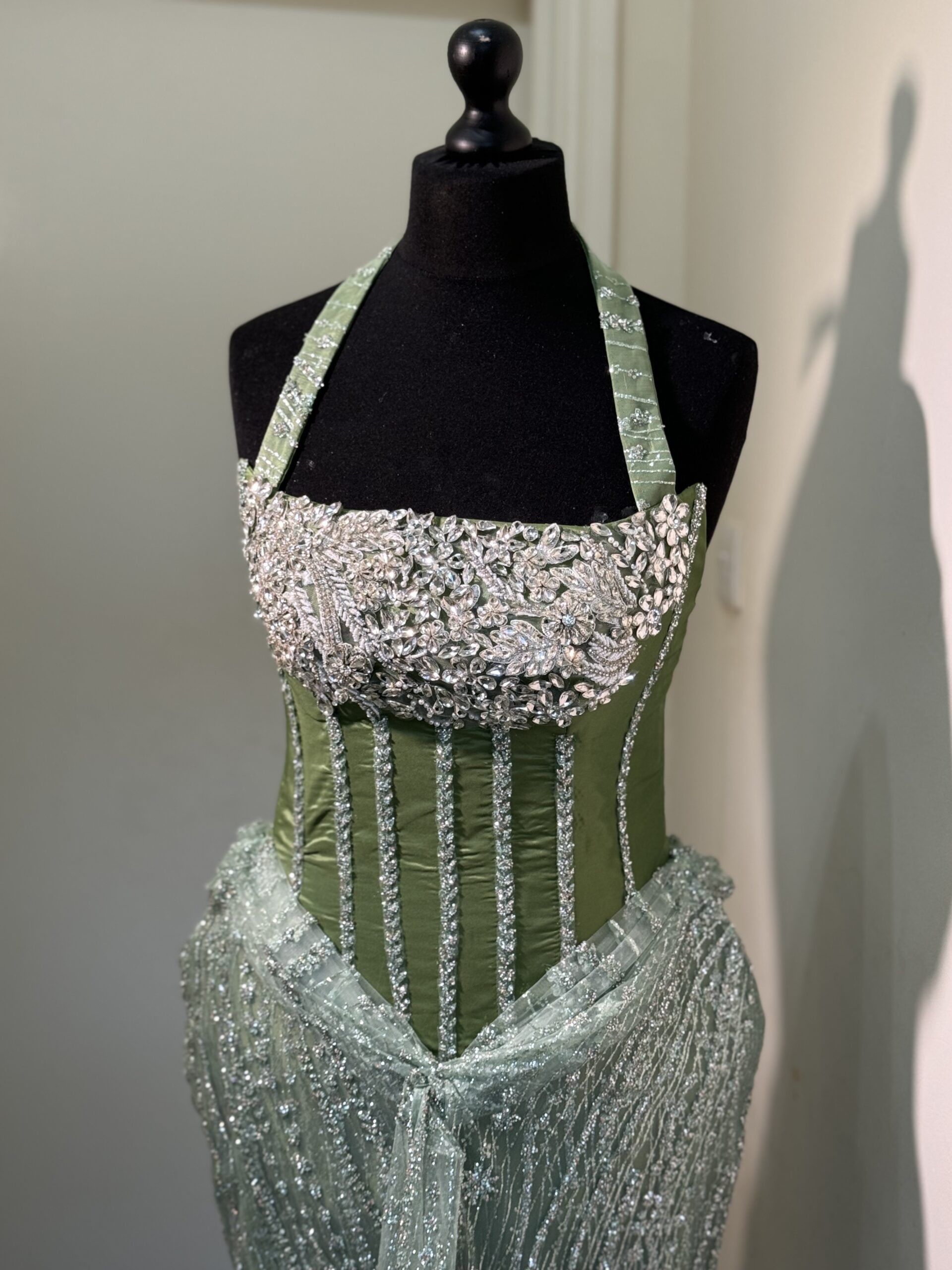 Step into the spotlight with this regal emerald and mint green gown. Combining a structured, jewel-encrusted corset with a flowing, shimmering skirt, this dress is the definition of red-carpet elegance.