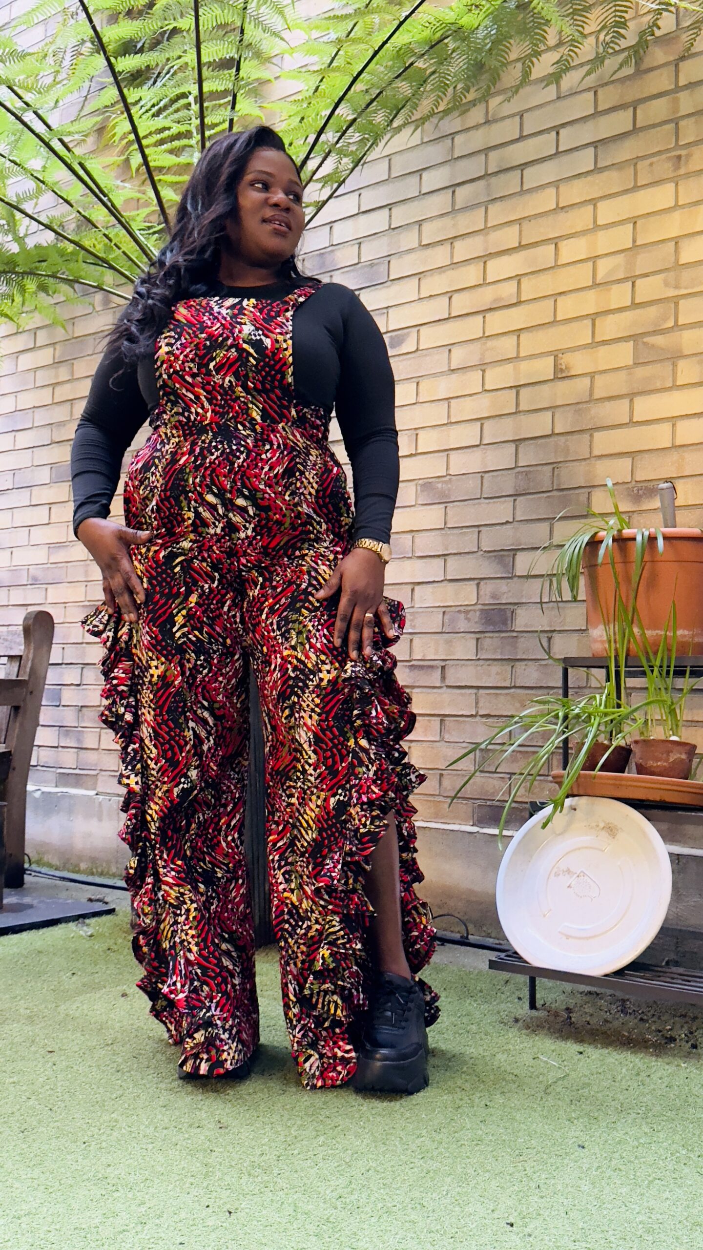 Step out in style with this fun and vibrant ruffled jumpsuit. Featuring a mix of bold patterns and a unique design, this piece is perfect for making a statement while staying comfortable.