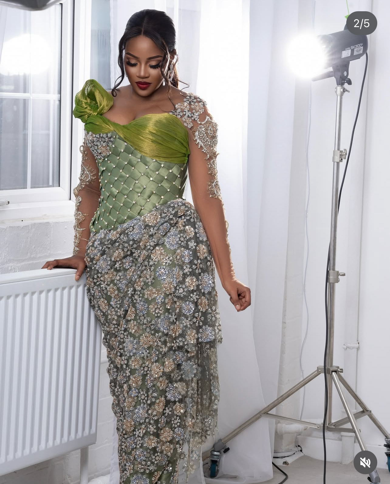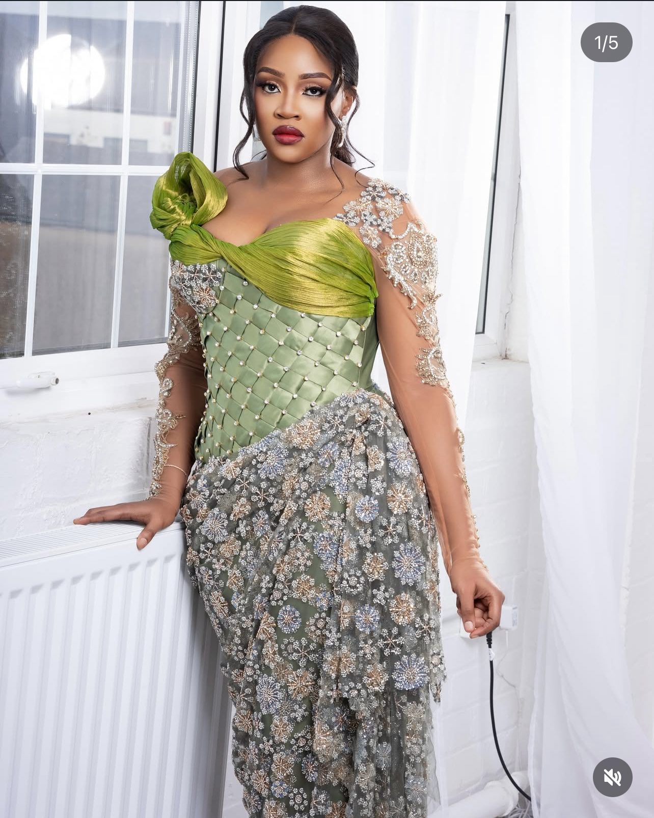 Step into a world of luxury with this breathtaking sage green and silver dress. It is a beautiful mix of textures, combining a modern satin corset with a romantic, floor-length lace skirt. The sheer long sleeves are finished with pretty silver flowers, creating a look that is both royal and modern.