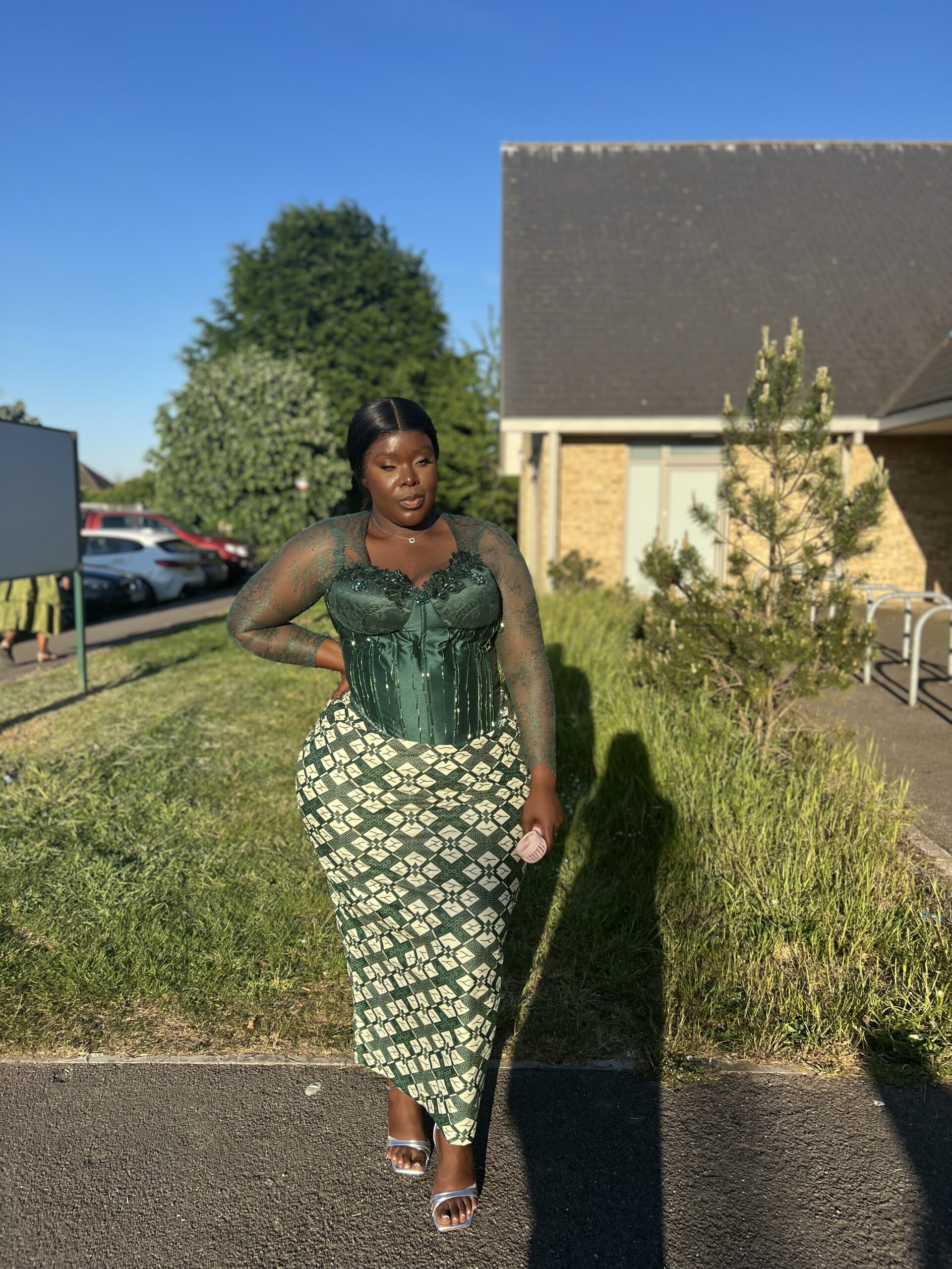 Feel like royalty in this rich emerald green ensemble, where a beautifully structured corset meets a unique patterned skirt for an unforgettable evening experience.
