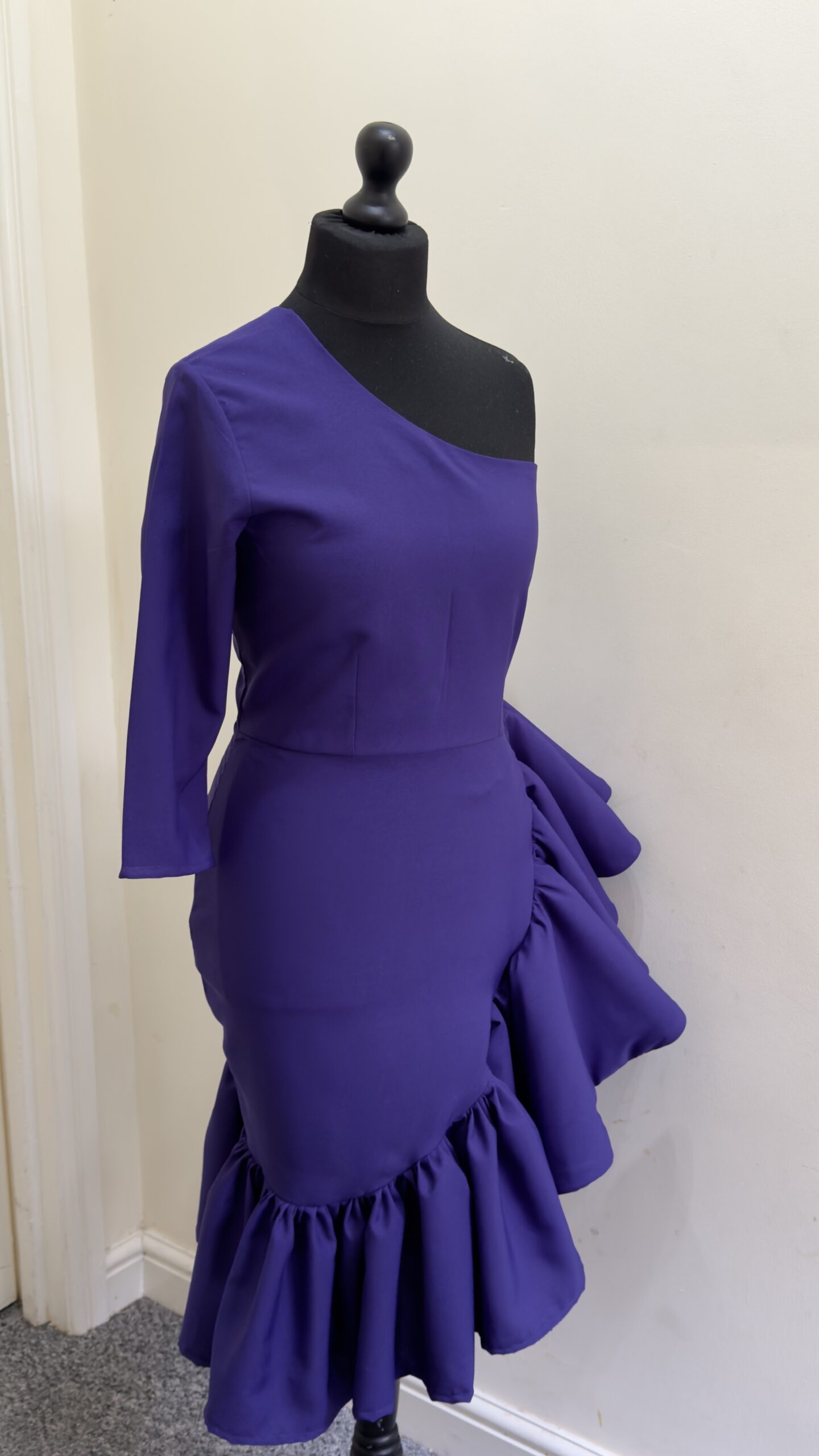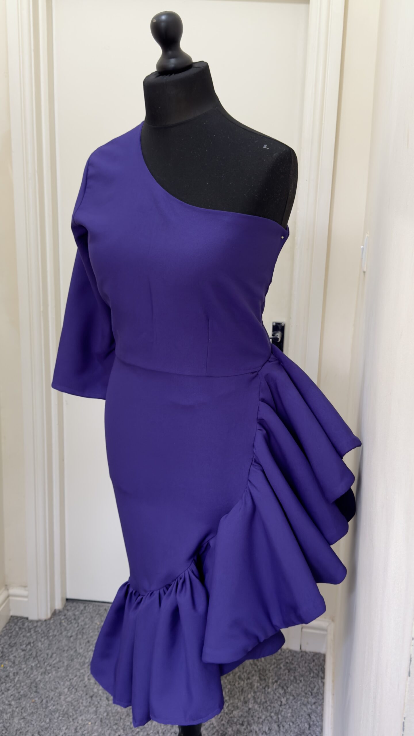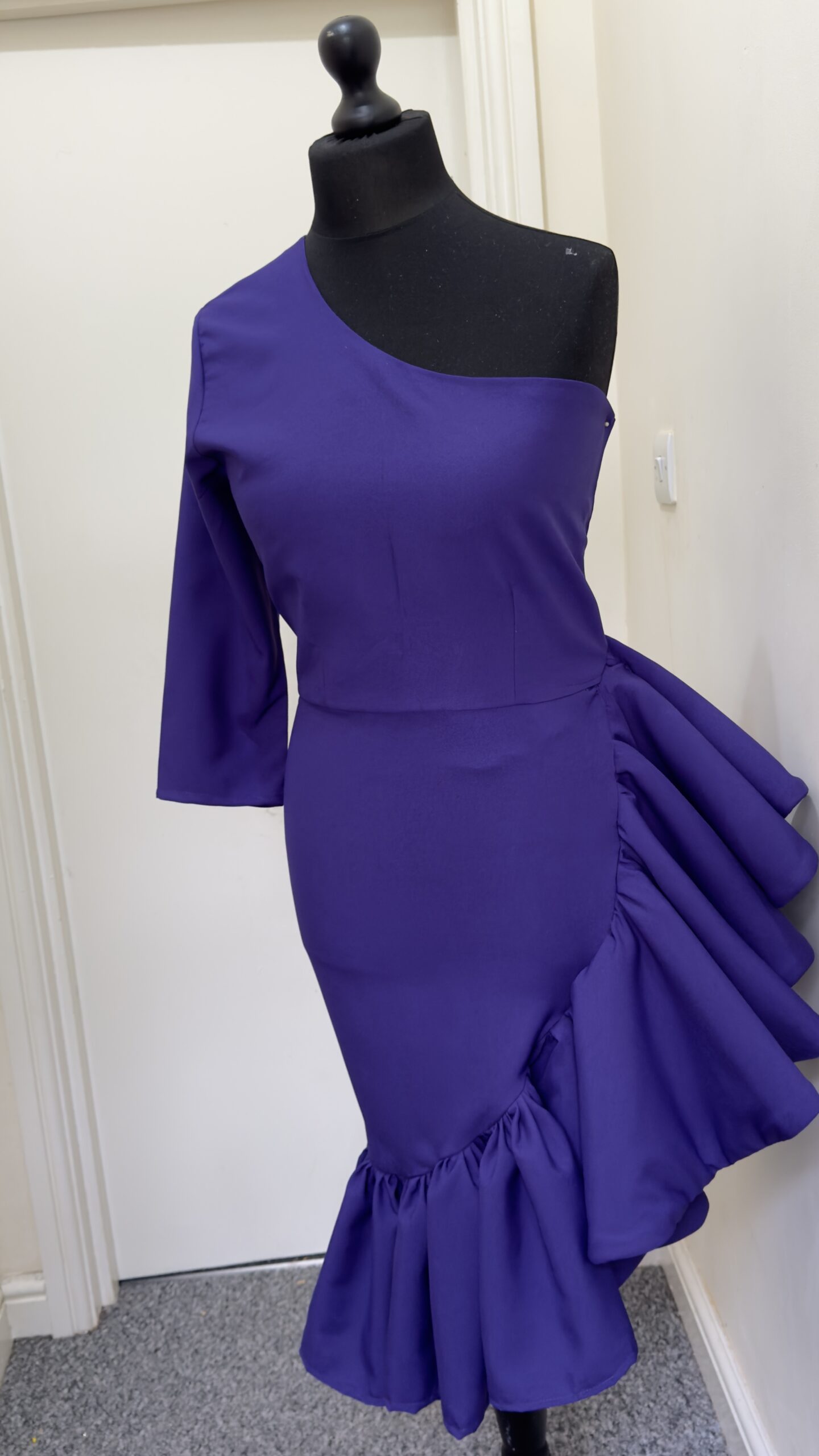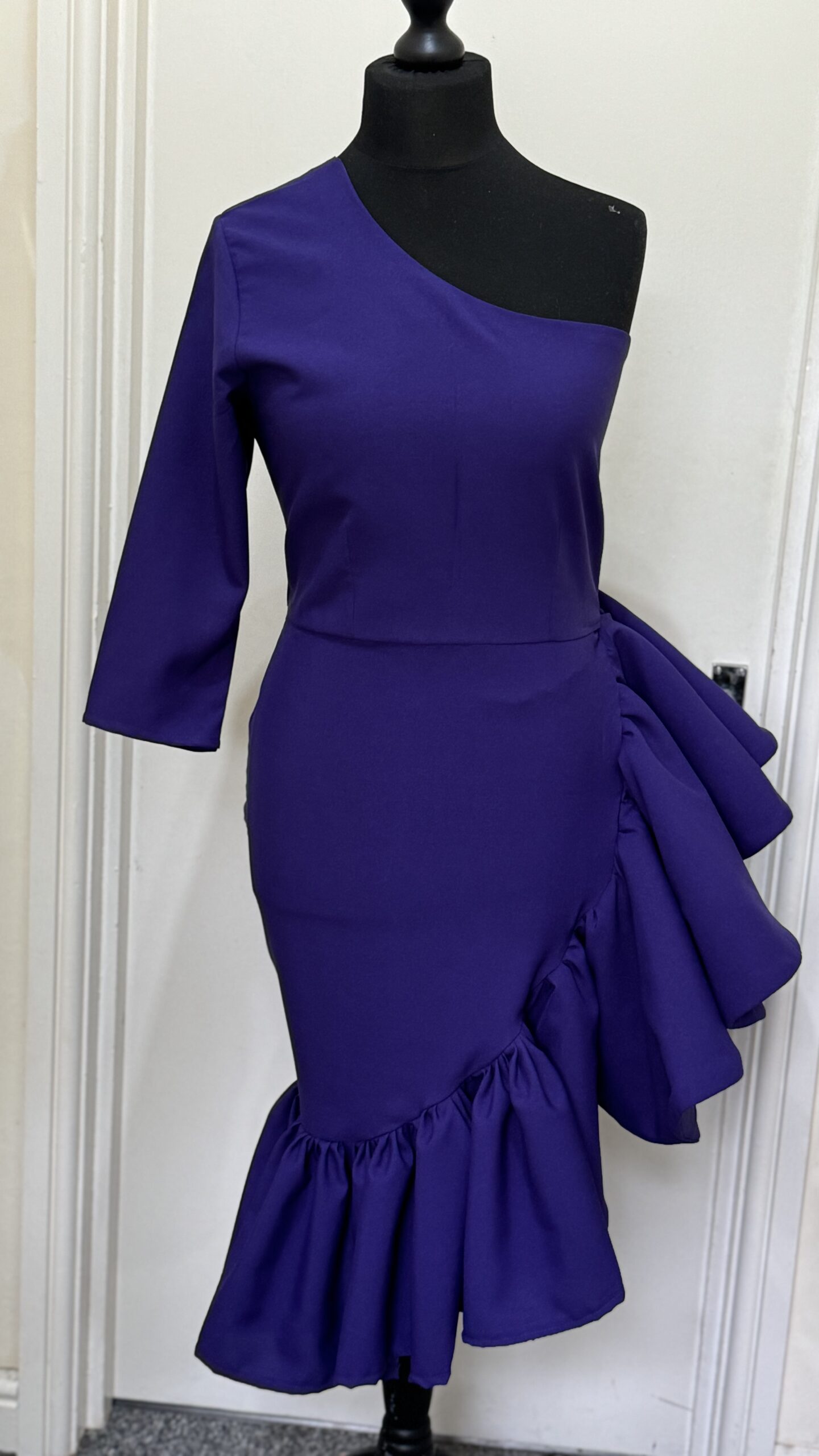 Step into the room with confidence in this bold purple dress, featuring a modern one-shoulder design and dramatic ruffles that make every movement feel like a celebration.